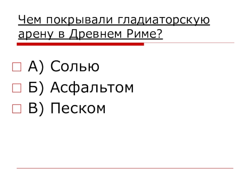 Чем покрывали гладиаторскую арену в Древнем Риме?А) СольюБ) АсфальтомВ) Песком