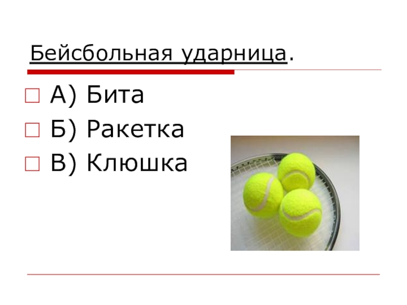 Бейсбольная ударница. А) БитаБ) РакеткаВ) Клюшка