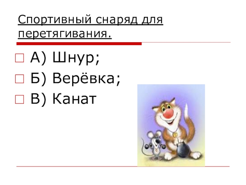 Спортивный снаряд для перетягивания. А) Шнур;Б) Верёвка;В) Канат