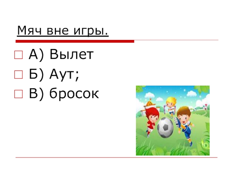 Мяч вне игры. А) ВылетБ) Аут;В) бросок