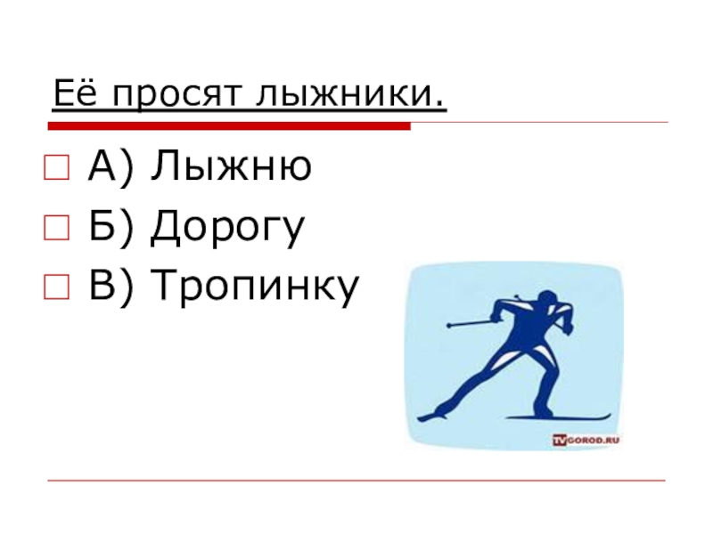Её просят лыжники. А) ЛыжнюБ) ДорогуВ) Тропинку