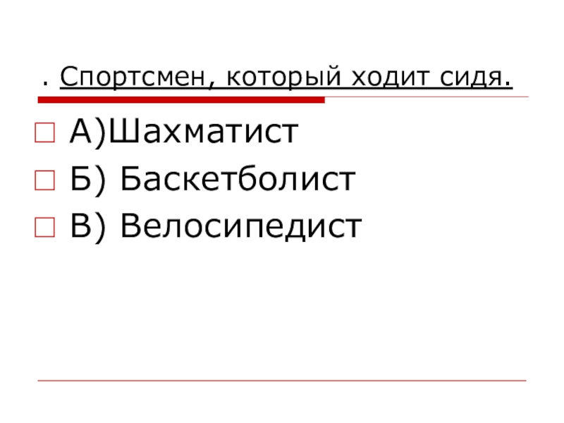 . Спортсмен, который ходит сидя. А)ШахматистБ) БаскетболистВ) Велосипедист