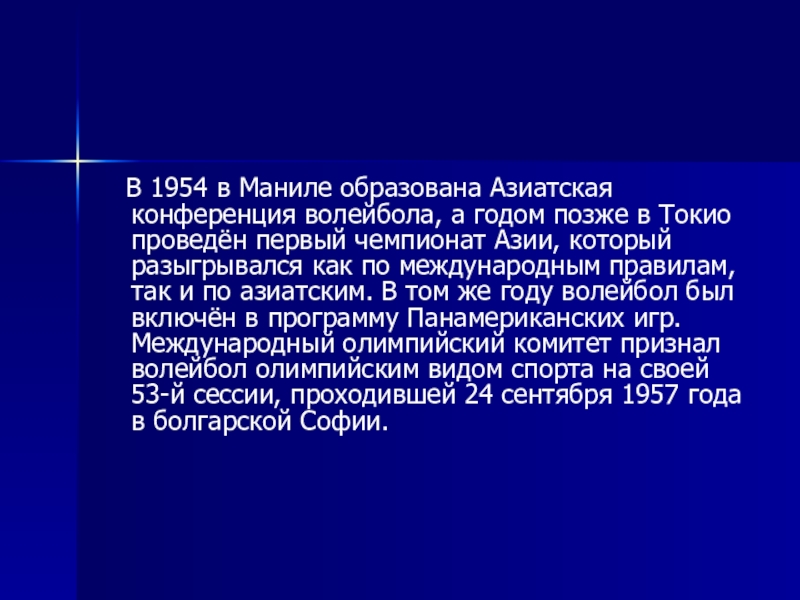 В 1954 в Маниле образована Азиатская конференция волейбола, а