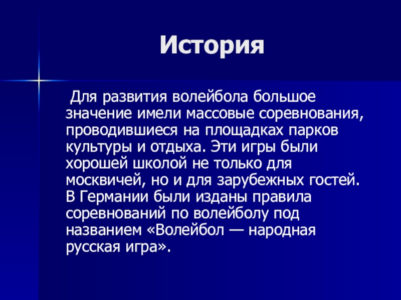 на площадках парков культуры и отдыха. Эти игры были хорошей школой не только для москвичей, но и для зарубежных гостей. В Германии были изданы правила соревнований по волейболу под названием «Волейбол — народная русская игра».