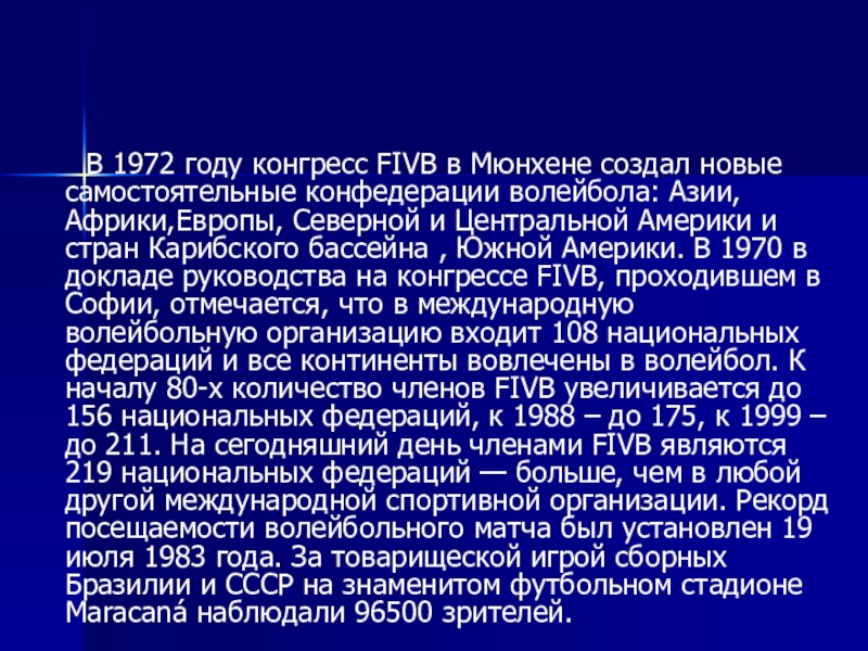 новые самостоятельные конфедерации волейбола: Азии, Африки,Европы, Северной и Центральной Америки и стран Карибского бассейна , Южной Америки. В 1970 в докладе руководства на конгрессе FIVB, проходившем в Софии, отмечается, что в международную волейбольную организацию входит 108 национальных федераций и все континенты вовлечены в волейбол. К началу 80-х количество членов FIVB увеличивается до 156 национальных федераций, к 1988 – до 175, к 1999 – до 211. На сегодняшний день членами FIVB являются 219 национальных федераций — больше, чем в любой другой международной спортивной организации. Рекорд посещаемости волейбольного матча был установлен 19 июля 1983 года. За товарищеской игрой сборных Бразилии и СССР на знаменитом футбольном стадионе Maracaná наблюдали 96500 зрителей.