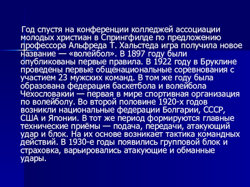 Спрингфилде по предложению профессора Альфреда Т. Хальстеда игра получила новое название — «волейбол». В 1897 году были опубликованы первые правила. В 1922 году в Бруклине проведены первые общенациональные соревнования с участием 23 мужских команд. В том же году была образована федерация баскетбола и волейбола Чехословакии — первая в мире спортивная организация по волейболу. Во второй половине 1920-х годов возникли национальные федерации Болгарии, СССР, США и Японии. В тот же период формируются главные технические приёмы — подача, передачи, атакующий удар и блок. На их основе возникает тактика командных действий. В 1930-е годы появились групповой блок и страховка, варьировались атакующие и обманные удары.
