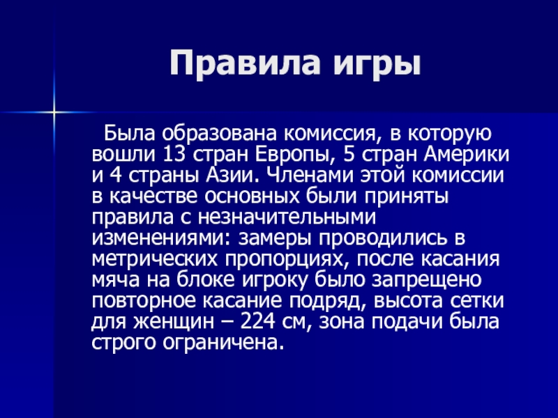 стран Европы, 5 стран Америки и 4 страны Азии. Членами этой комиссии в качестве основных были приняты правила с незначительными изменениями: замеры проводились в метрических пропорциях, после касания мяча на блоке игроку было запрещено повторное касание подряд, высота сетки для женщин – 224 см, зона подачи была строго ограничена.