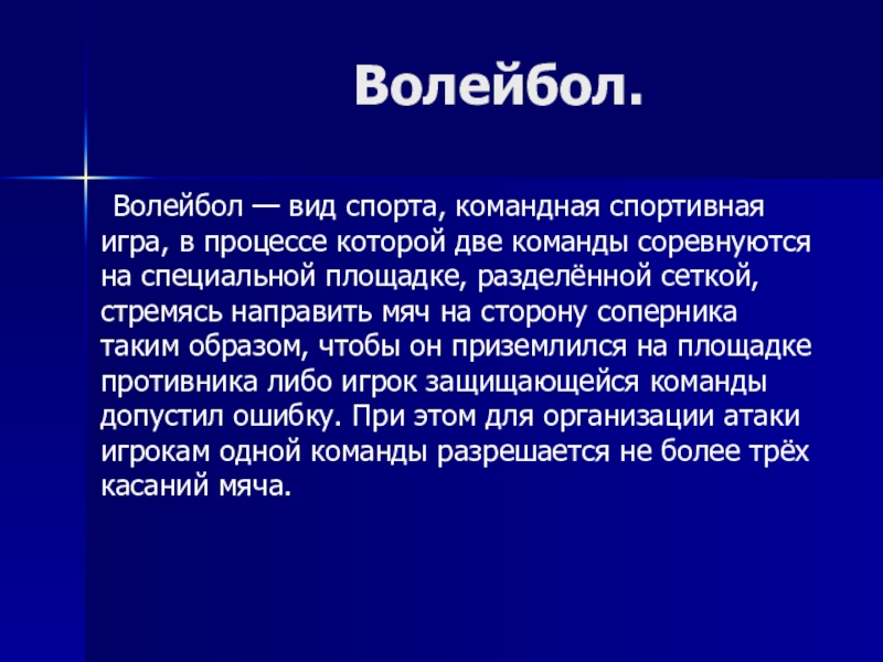 игра, в процессе которой две команды соревнуются на специальной площадке, разделённой сеткой, стремясь направить мяч на сторону соперника таким образом, чтобы он приземлился на площадке противника либо игрок защищающейся команды допустил ошибку. При этом для организации атаки игрокам одной команды разрешается не более трёх касаний мяча.