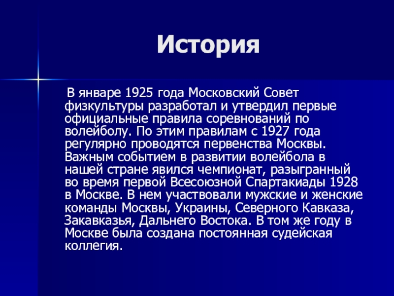 и утвердил первые официальные правила соревнований по волейболу. По этим правилам с 1927 года регулярно проводятся первенства Москвы. Важным событием в развитии волейбола в нашей стране явился чемпионат, разыгранный во время первой Всесоюзной Спартакиады 1928 в Москве. В нем участвовали мужские и женские команды Москвы, Украины, Северного Кавказа, Закавказья, Дальнего Востока. В том же году в Москве была создана постоянная судейская коллегия.