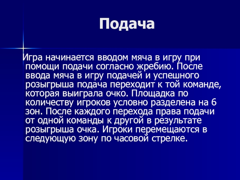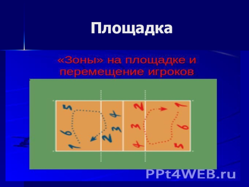 жребию. После ввода мяча в игру подачей и успешного розыгрыша подача переходит к той команде, которая выиграла очко. Площадка по количеству игроков условно разделена на 6 зон. После каждого перехода права подачи от одной команды к другой в результате розыгрыша очка. Игроки перемещаются в следующую зону по часовой стрелке.