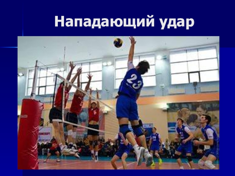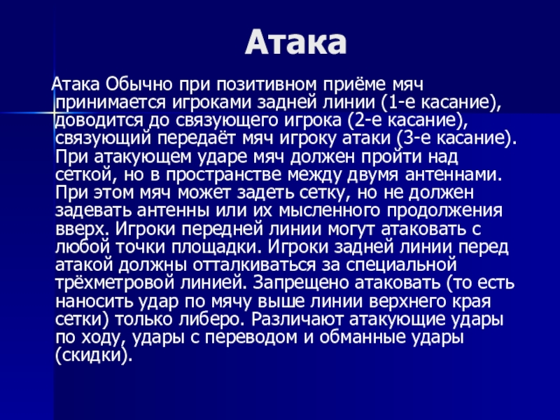 линии (1-е касание), доводится до связующего игрока (2-е касание), связующий передаёт мяч игроку атаки (3-е касание). При атакующем ударе мяч должен пройти над сеткой, но в пространстве между двумя антеннами. При этом мяч может задеть сетку, но не должен задевать антенны или их мысленного продолжения вверх. Игроки передней линии могут атаковать с любой точки площадки. Игроки задней линии перед атакой должны отталкиваться за специальной трёхметровой линией. Запрещено атаковать (то есть наносить удар по мячу выше линии верхнего края сетки) только либеро. Различают атакующие удары по ходу, удары с переводом и обманные удары (скидки).