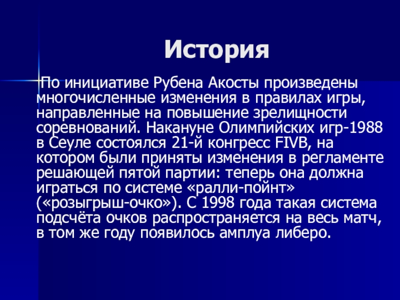 игры, направленные на повышение зрелищности соревнований. Накануне Олимпийских игр-1988 в Сеуле состоялся 21-й конгресс FIVB, на котором были приняты изменения в регламенте решающей пятой партии: теперь она должна играться по системе «ралли-пойнт» («розыгрыш-очко»). С 1998 года такая система подсчёта очков распространяется на весь матч, в том же году появилось амплуа либеро.