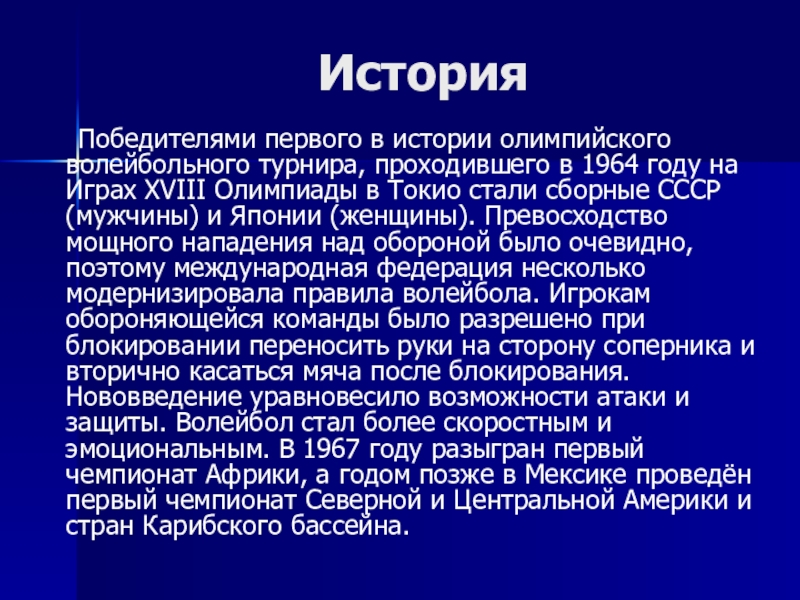 в 1964 году на Играх XVIII Олимпиады в Токио стали сборные СССР (мужчины) и Японии (женщины). Превосходство мощного нападения над обороной было очевидно, поэтому международная федерация несколько модернизировала правила волейбола. Игрокам обороняющейся команды было разрешено при блокировании переносить руки на сторону соперника и вторично касаться мяча после блокирования. Нововведение уравновесило возможности атаки и защиты. Волейбол стал более скоростным и эмоциональным. В 1967 году разыгран первый чемпионат Африки, а годом позже в Мексике проведён первый чемпионат Северной и Центральной Америки и стран Карибского бассейна.