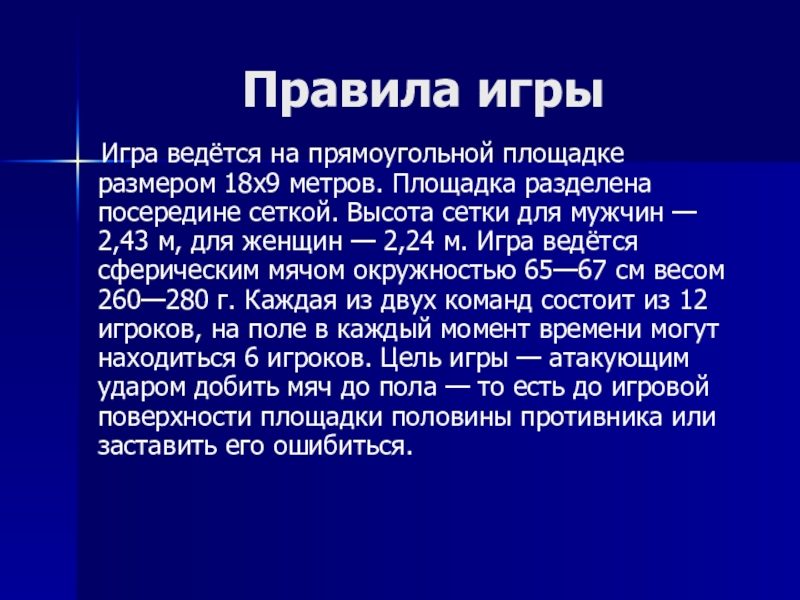 Площадка разделена посередине сеткой. Высота сетки для мужчин — 2,43 м, для женщин — 2,24 м. Игра ведётся сферическим мячом окружностью 65—67 см весом 260—280 г. Каждая из двух команд состоит из 12 игроков, на поле в каждый момент времени могут находиться 6 игроков. Цель игры — атакующим ударом добить мяч до пола — то есть до игровой поверхности площадки половины противника или заставить его ошибиться.