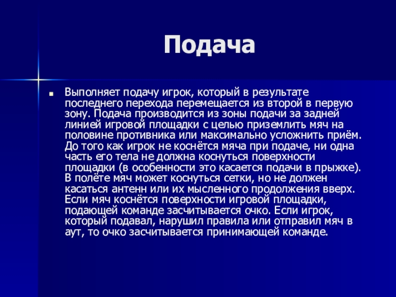 в первую зону. Подача производится из зоны подачи за задней линией игровой площадки с целью приземлить мяч на половине противника или максимально усложнить приём. До того как игрок не коснётся мяча при подаче, ни одна часть его тела не должна коснуться поверхности площадки (в особенности это касается подачи в прыжке). В полёте мяч может коснуться сетки, но не должен касаться антенн или их мысленного продолжения вверх. Если мяч коснётся поверхности игровой площадки, подающей команде засчитывается очко. Если игрок, который подавал, нарушил правила или отправил мяч в аут, то очко засчитывается принимающей команде.