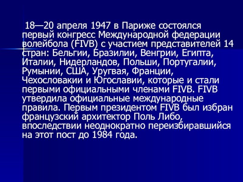 федерации волейбола (FIVB) с участием представителей 14 стран: Бельгии, Бразилии, Венгрии, Египта, Италии, Нидерландов, Польши, Португалии, Румынии, США, Уругвая, Франции, Чехословакии и Югославии, которые и стали первыми официальными членами FIVB. FIVB утвердила официальные международные правила. Первым президентом FIVB был избран французский архитектор Поль Либо, впоследствии неоднократно переизбиравшийся на этот пост до 1984 года.