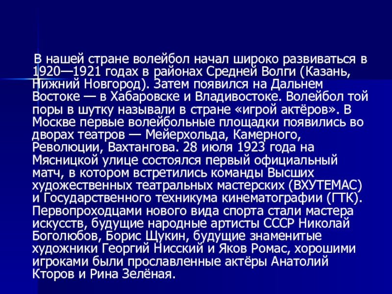 годах в районах Средней Волги (Казань, Нижний Новгород). Затем появился на Дальнем Востоке — в Хабаровске и Владивостоке. Волейбол той поры в шутку называли в стране «игрой актёров». В Москве первые волейбольные площадки появились во дворах театров — Мейерхольда, Камерного, Революции, Вахтангова. 28 июля 1923 года на Мясницкой улице состоялся первый официальный матч, в котором встретились команды Высших художественных театральных мастерских (ВХУТЕМАС) и Государственного техникума кинематографии (ГТК). Первопроходцами нового вида спорта стали мастера искусств, будущие народные артисты СССР Николай Боголюбов, Борис Щукин, будущие знаменитые художники Георгий Нисский и Яков Ромас, хорошими игроками были прославленные актёры Анатолий Кторов и Рина Зелёная.