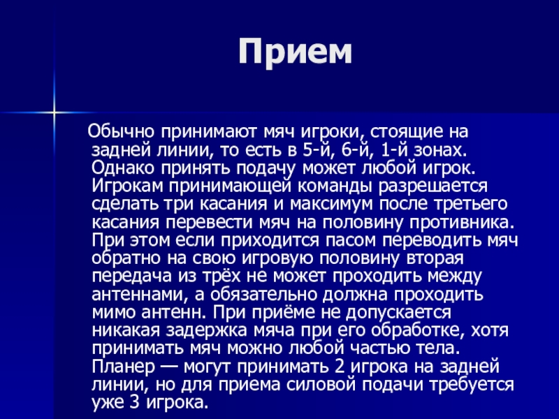 есть в 5-й, 6-й, 1-й зонах. Однако принять подачу может любой игрок. Игрокам принимающей команды разрешается сделать три касания и максимум после третьего касания перевести мяч на половину противника. При этом если приходится пасом переводить мяч обратно на свою игровую половину вторая передача из трёх не может проходить между антеннами, а обязательно должна проходить мимо антенн. При приёме не допускается никакая задержка мяча при его обработке, хотя принимать мяч можно любой частью тела. Планер — могут принимать 2 игрока на задней линии, но для приема силовой подачи требуется уже 3 игрока.