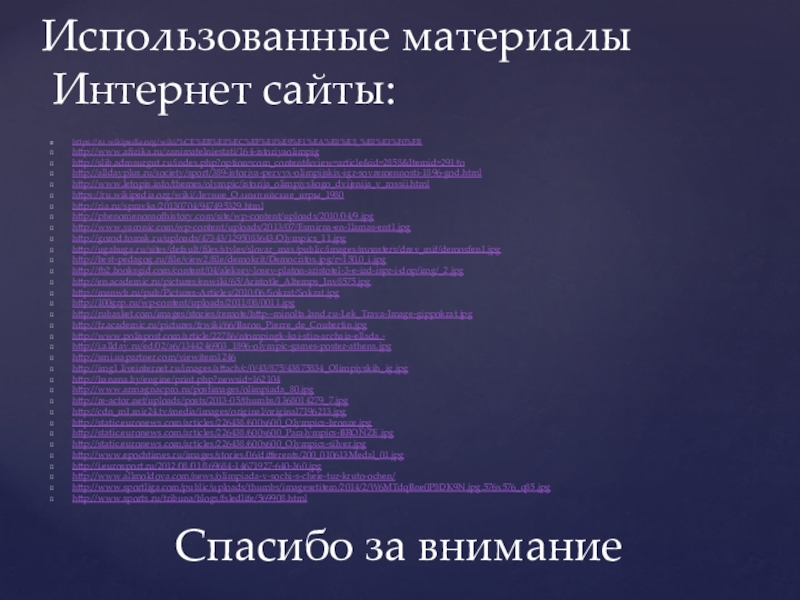 https://ru.wikipedia.org/wiki/%CE%EB%E8%EC%EF%E8%E9%F1%EA%E8%E5_%E8%E3%F0%FBhttp://www.afizika.ru/zanimatelniestati/164-istoriyaolimpighttp://slib.admsurgut.ru/index.php?option=com_content&view=article&id=2858&Itemid=291#ohttp://alldayplus.ru/society/sport/389-istoriya-pervyx-olimpijskix-igr-sovremennosti-1896-god.htmlhttp://www.letopis.info/themes/olympic/istorija_olimpiyskogo_dvijenija_v_rossii.htmlhttps://ru.wikipedia.org/wiki/Летние_Олимпийские_игры_1980http://ria.ru/spravka/20130704/947495329.htmlhttp://phenomenonsofhistory.com/site/wp-content/uploads/2010/04/9.jpghttp://www.yaconic.com/wp-content/uploads/2013/07/Esmirna-en-llamas-ent1.jpghttp://gorod.tomsk.ru/uploads/47343/1295083643/Olympics_11.jpghttp://ugabuga.ru/sites/default/files/styles/slovar_max/public/images/monsters/drev_mif/demosfen1.jpghttp://best-pedagog.ru/file/view2/file/demokrit/Democritos.jpg/r=150,0_i.jpghttp://fb2.booksgid.com/content/04/aleksey-losev-platon-aristotel-3-e-izd-ispr-i-dop/img/_2.jpghttp://en.academic.ru/pictures/enwiki/65/Aristotle_Altemps_Inv8575.jpghttp://manwb.ru/pub/Pictures-Articles/2010/06/Sokrat/Sokrat.jpghttp://100grp.ru/wp-content/uploads/2011/08/0011.jpghttp://rubasket.com/images/stories/remote/http--minolta.land.ru-Lek_Trava-Image-gippokrat.jpghttp://fr.academic.ru/pictures/frwiki/66/Baron_Pierre_de_Coubertin.jpghttp://www.polispost.com/article/22786/ntompingk-kai-stin-archaia-ellada.-http://i.allday.ru/ed/02/a6/1344246903_1896-olympic-games-poster-athens.jpghttp://smi.uapartner.com/viewitem1246http://img1.liveinternet.ru/images/attach/c/0/43/875/43875834_Olimpiyskih_ig.jpghttp://banana.by/engine/print.php?newsid=162104http://www.armagnacpro.ru/postimages/olimpiada_80.jpghttp://re-actor.net/uploads/posts/2013-05/thumbs/1368014279_7.jpghttp://cdn_m1.mir24.tv/media/images/original/original7196213.jpghttp://static.euronews.com/articles/226438/600x600_Olympics-bronze.jpghttp://static.euronews.com/articles/226438/600x600_Paralympics-BRONZE.jpghttp://static.euronews.com/articles/226438/600x600_Olympics-silver.jpghttp://www.epochtimes.ru/images/stories/06/differents/200_010613Medal_01.jpghttp://i.eurosport.ru/2012/08/01/869684-14671927-640-360.jpghttp://www.allmoldova.com/news/olimpiada-v-sochi-s-cheie-tur-kruto-ochen/http://www.sportliga.com/public/uploads/thumbs/imagesetitem/2014/2/W6MTdqBne0P8DK9N.jpg.576x576_q85.jpghttp://www.sports.ru/tribuna/blogs/fsledlife/569908.html     Использованные материалы  Интернет сайты:Спасибо за внимание