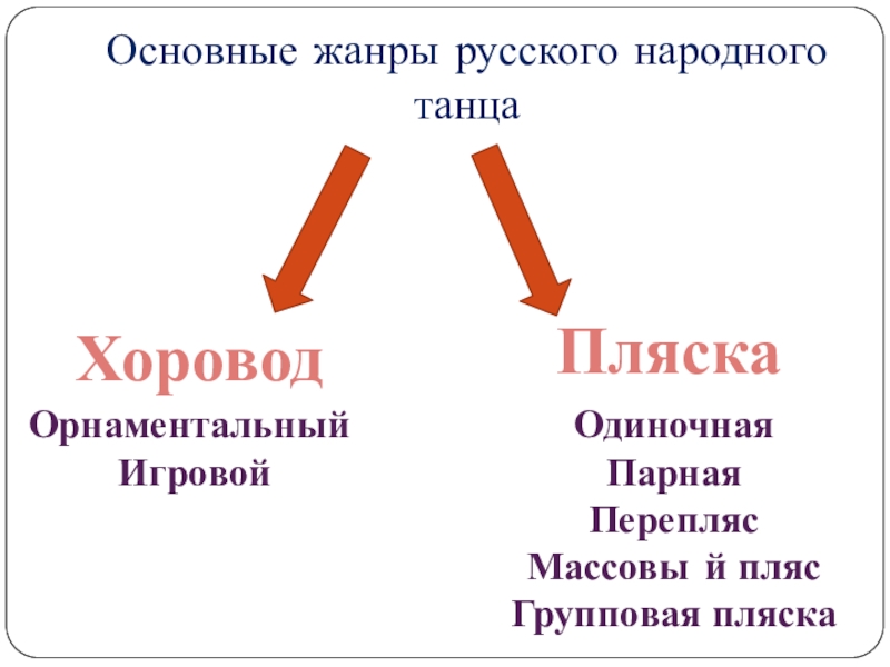 Основные жанры русского народного танца   ХороводПляскаОрнаментальный ИгровойОдиночнаяПарнаяПереплясМассовы	й плясГрупповая пляска