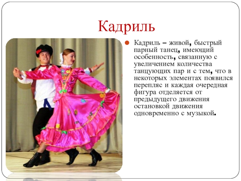 Кадриль – живой, быстрый парный танец, имеющий особенность, связанную с увеличением