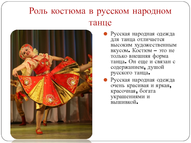 Роль костюма в русском народном танцеРусская народная одежда для танца отличается высоким художественным вкусом. Костюм – это