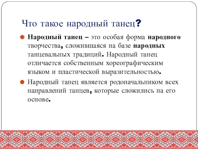Что такое народный танец?Народный танец – это особая форма народного творчества, сложившаяся на базе народных танцевальных традиций.