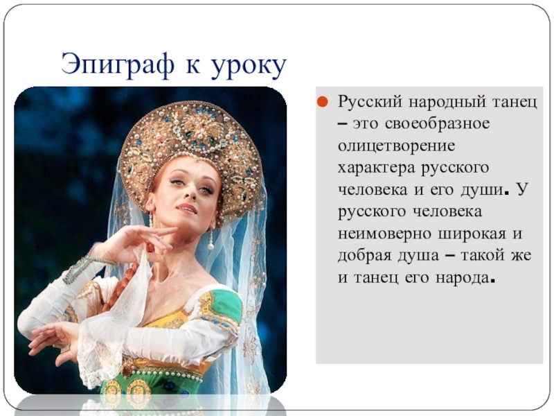 Эпиграф к урокуРусский народный танец – это своеобразное олицетворение характера русского человека и его души. У русского