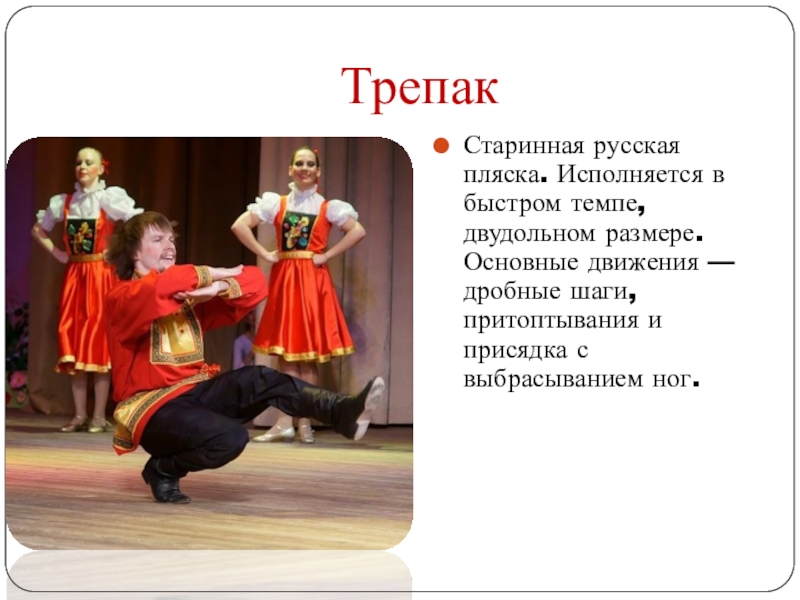 ТрепакСтаринная русская пляска. Исполняется в быстром темпе, двудольном размере. Основные движения — дробные шаги, притоптывания и присядка