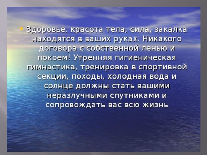 с собственной ленью и покоем! Утренняя гигиеническая гимнастика, тренировка в спортивной секции, походы, холодная вода и солнце должны стать вашими неразлучными спутниками и сопровождать вас всю жизнь.