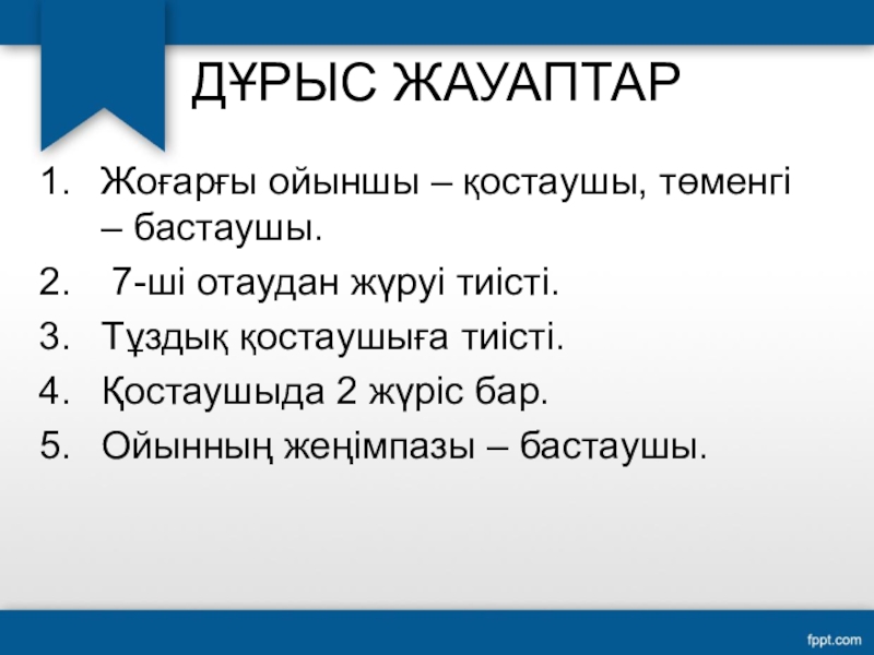 ДҰРЫС ЖАУАПТАРЖоғарғы ойыншы – қостаушы, төменгі – бастаушы. 7-ші отаудан жүруі тиісті.Тұздық қостаушыға тиісті.Қостаушыда 2 жүріс бар.Ойынның