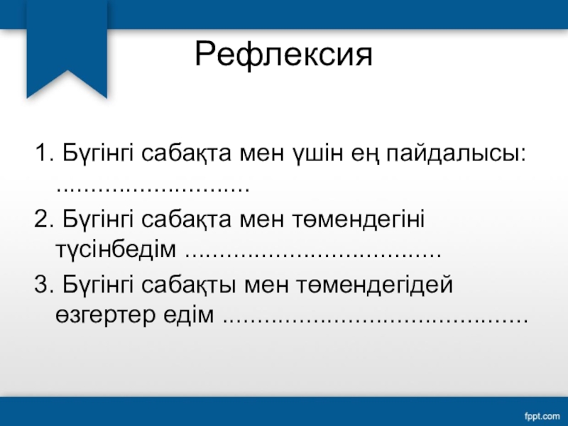 Рефлексия1. Бүгінгі сабақта мен үшін ең пайдалысы: ............................2. Бүгінгі сабақта мен төмендегіні түсінбедім .....................................3. Бүгінгі сабақты мен