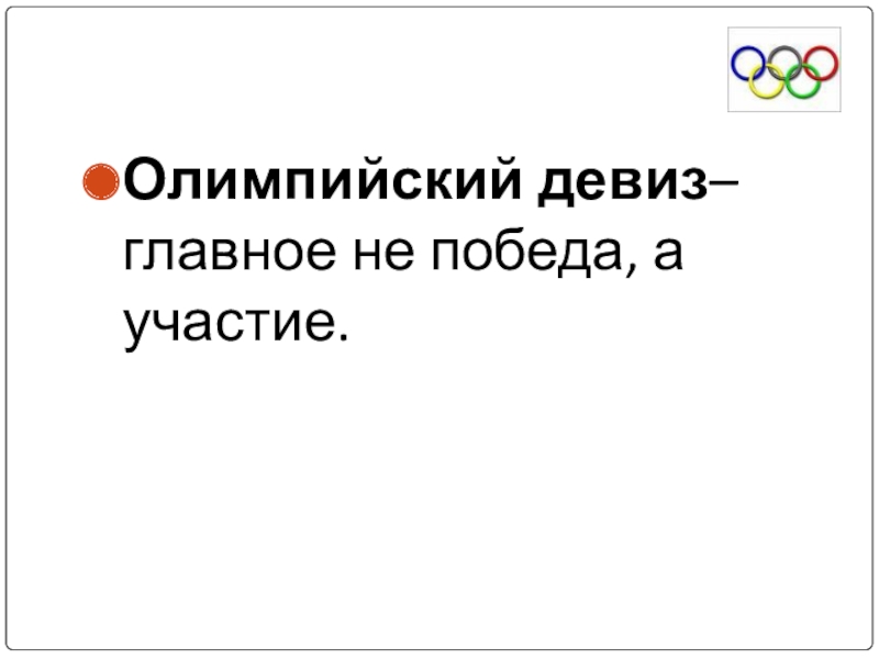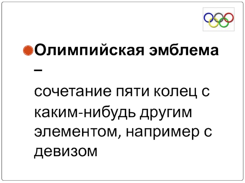 Олимпийская эмблема –  сочетание пяти колец с  каким-нибудь другим элементом, например с девизом