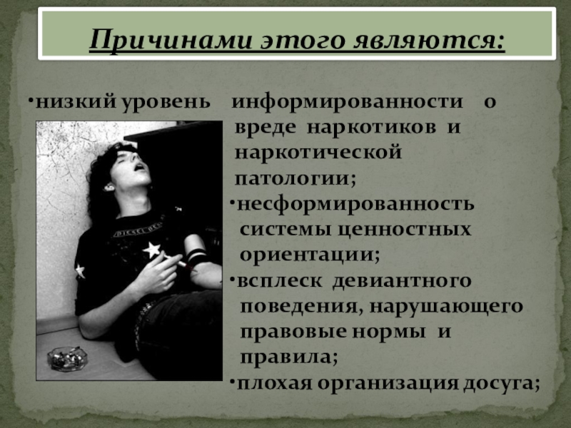 •легкая доступность наркотиков в кафе, на дискотеках, в парках;