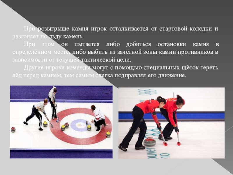 Слайд 8 При розыгрыше камня игрок отталкивается от стартовой колодки и разгоняет по