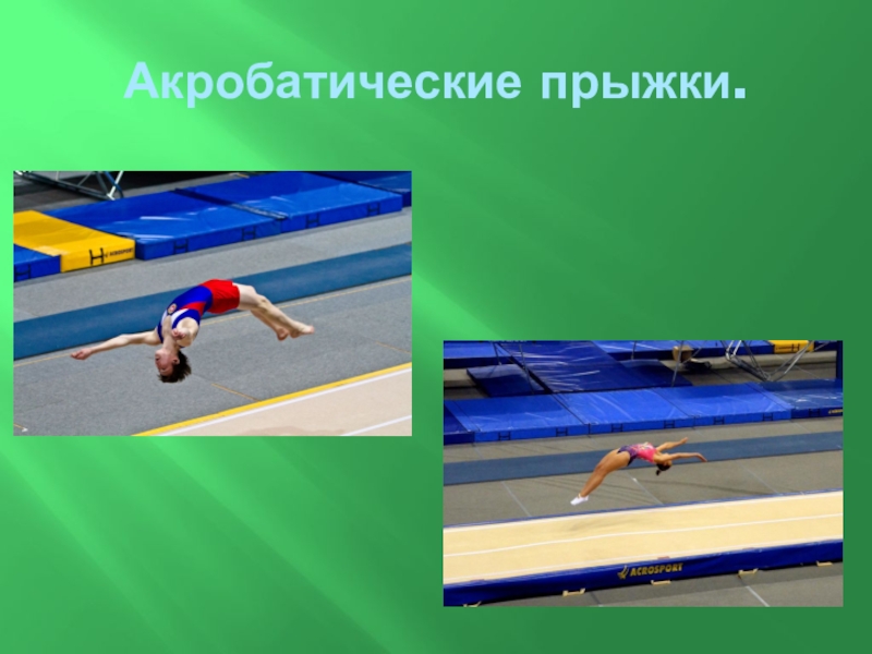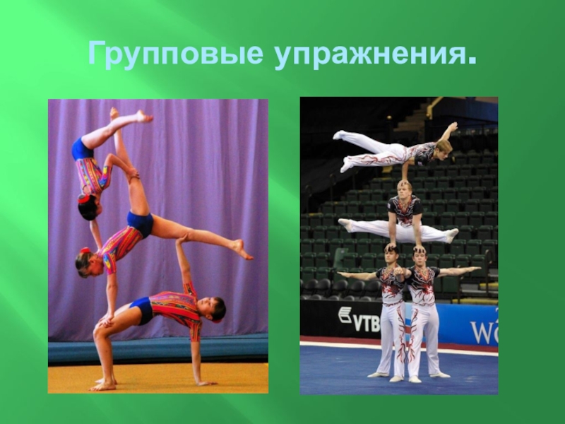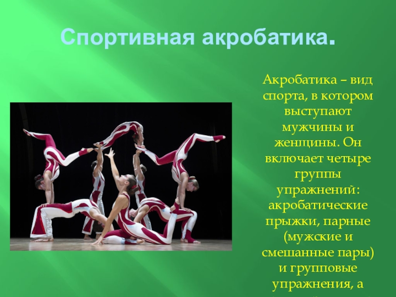и женщины. Он включает четыре группы упражнений: акробатические прыжки, парные (мужские и смешанные пары) и групповые упражнения, а также прыжки на батуте.