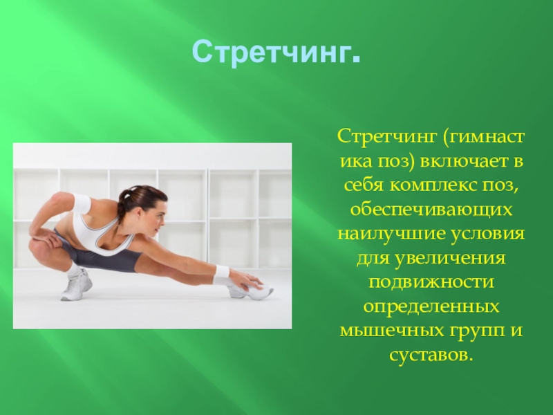 Стретчинг (гимнастика поз) включает в себя комплекс поз, обеспечивающих наилучшие условия