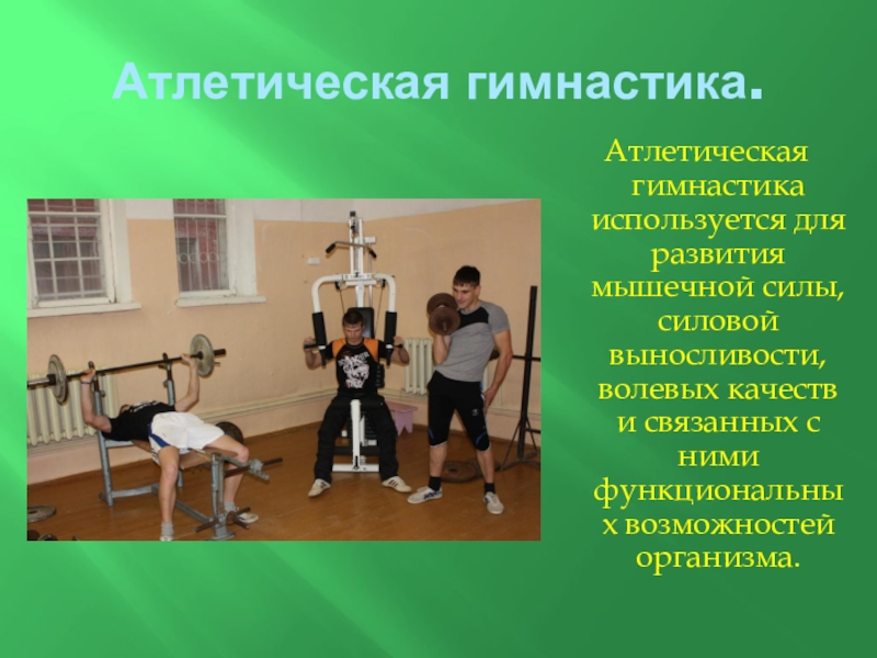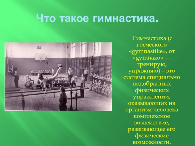«gymnazo» — тренирую, упражняю) – это система специально подобранных физических упражнений, оказывающих на организм человека комплексное воздействие, развивающее его физические возможности.