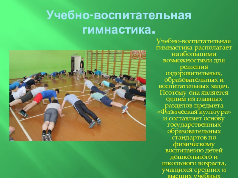Учебно-воспитательная гимнастика располагает наибольшими возможностями для решения оздоровительных,