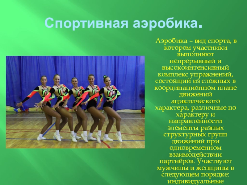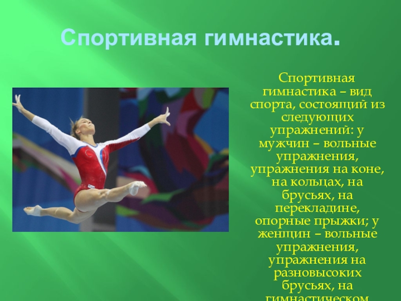 Основными спортивными видами гимнастики являются: спортивная гимнастика,