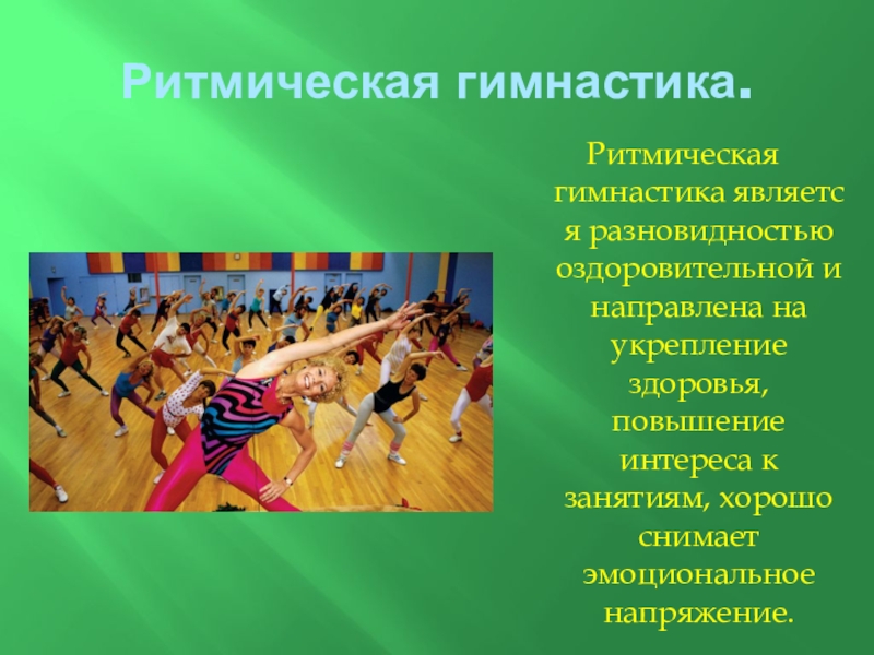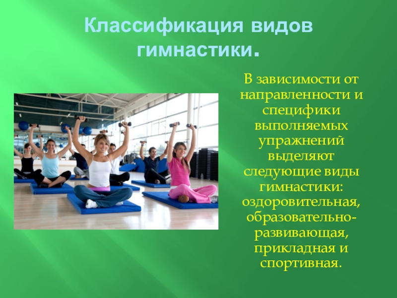 выполняемых упражнений выделяют следующие виды гимнастики: оздоровительная, образовательно-развивающая, прикладная и спортивная.