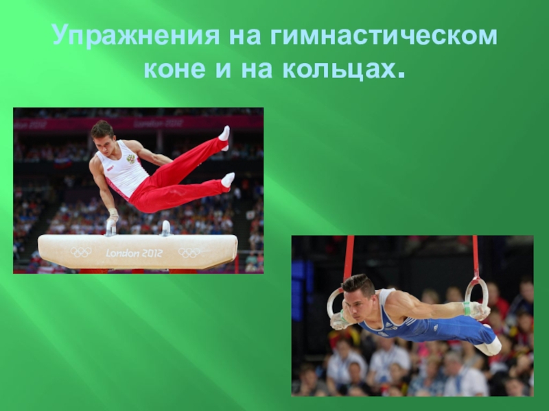 Слайд 25Упражнения на гимнастическом коне и на кольцах.