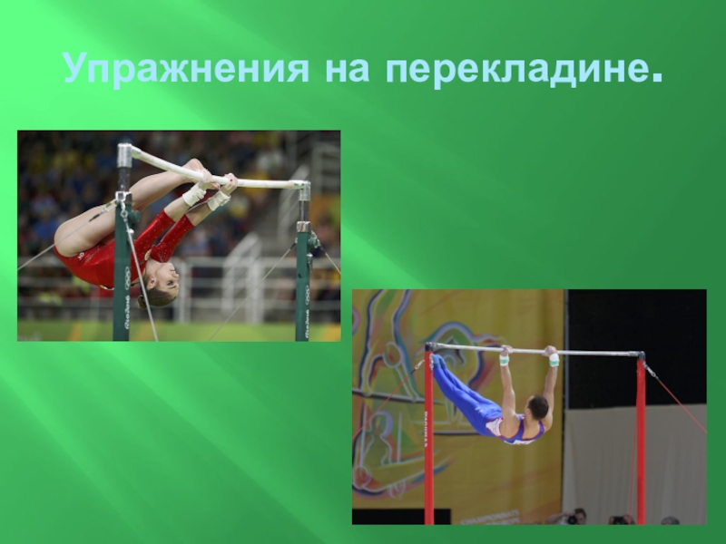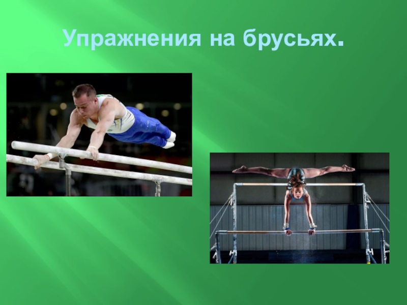 упражнений: у мужчин – вольные упражнения, упражнения на коне, на кольцах, на брусьях, на перекладине, опорные прыжки; у женщин – вольные упражнения, упражнения на разновысоких брусьях, на гимнастическом бревне, опорные прыжки.
