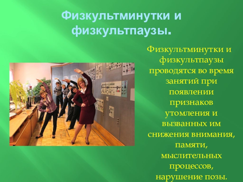 проводятся во время занятий при появлении признаков утомления и вызванных им снижения внимания, памяти, мыслительных процессов, нарушение позы.