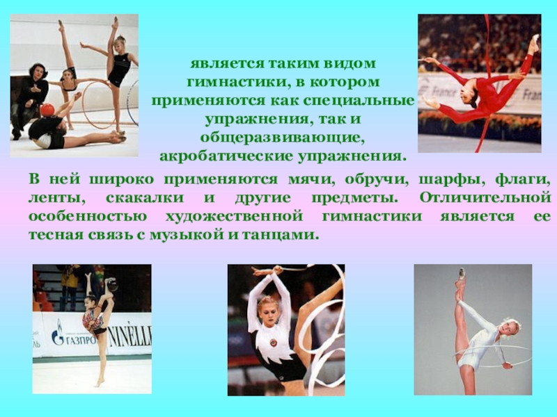 В ней широко применяются мячи, обручи, шарфы, флаги, ленты, скакалки и другие предметы. Отличительной особенностью художественной гимнастики является ее тесная связь с музыкой и танцами.