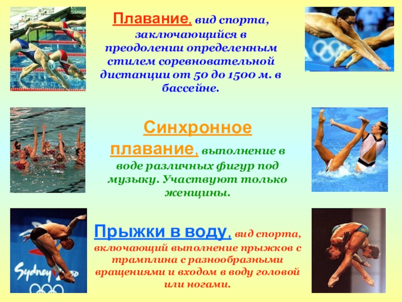 Синхронное плавание, выполнение в воде различных фигур под музыку. Участвуют только женщины.