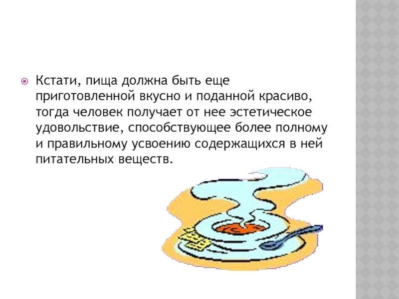 Слайд 8Кстати, пища должна быть еще приготовленной вкусно и поданной красиво, тогда