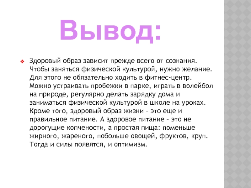 нужно желание. Для этого не обязательно ходить в фитнес-центр. Можно устраивать пробежки в парке, играть в волейбол на природе, регулярно делать зарядку дома и заниматься физической культурой в школе на уроках. Кроме того, здоровый образ жизни – это еще и правильное питание. А здоровое питание – это не дорогущие копчености, а простая пища: поменьше жирного, жареного, побольше овощей, фруктов, круп. Тогда и силы появятся, и оптимизм.