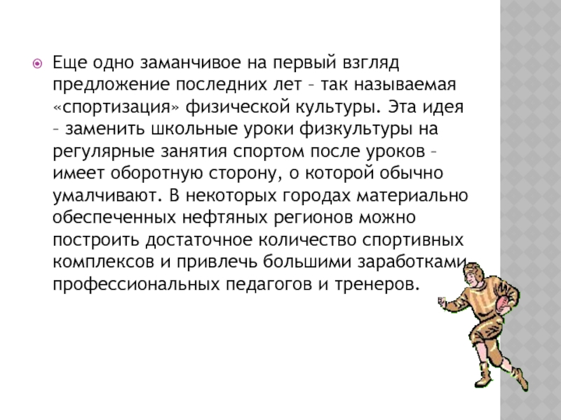 называемая «спортизация» физической культуры. Эта идея – заменить школьные уроки физкультуры на регулярные занятия спортом после уроков – имеет оборотную сторону, о которой обычно умалчивают. В некоторых городах материально обеспеченных нефтяных регионов можно построить достаточное количество спортивных комплексов и привлечь большими заработками профессиональных педагогов и тренеров.