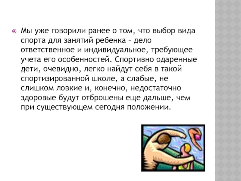 Слайд 27Мы уже говорили ранее о том, что выбор вида спорта для